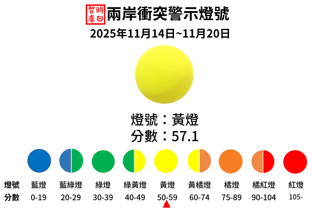 本期以15日的「四面環台」戰備警巡為基準,選擇11月14日-20日為觀測期,期間衝突分數由上期的46.8大幅上升至57.1,燈號也由綠黃燈升至需要警戒的黃燈。此次事件使得兩岸關係經過連續數月的降溫後,又重新點燃衝突的火種。