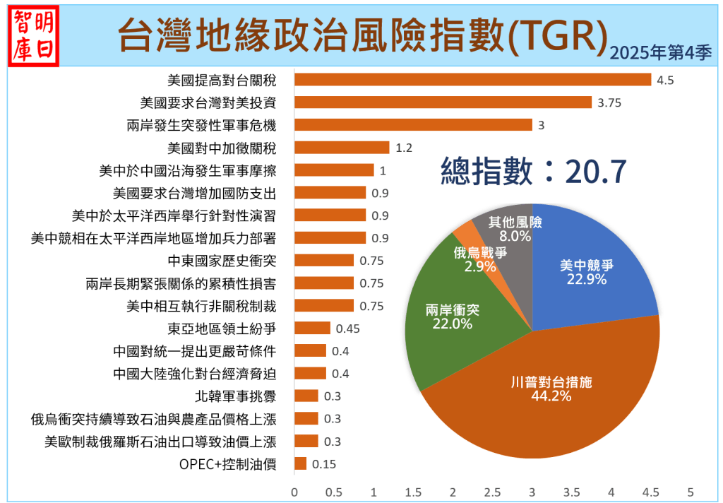 預測2025年第四季指數將由上期的16.9巨幅上升至20.7,季增幅度高達22.5%。本期指數驟升主要原因是川普要求台灣對美投資,由於金額相當龐大,一般預估至少3000億美元(9兆台幣)起跳,「川普對台措施」指數因而由上期5.2增加至9.15,幅度高達76%。其次,儘管川普對台關稅的稅率由32%降低至20%,但其可能性由中度可能升高至高度可能,故指數亦增加0.7。另外,還有一項使指數減少的項目,即「北韓軍事挑釁」,由於北韓威脅降低,調降其可能性由高度可能至中度可能,指數因而減少0.15。