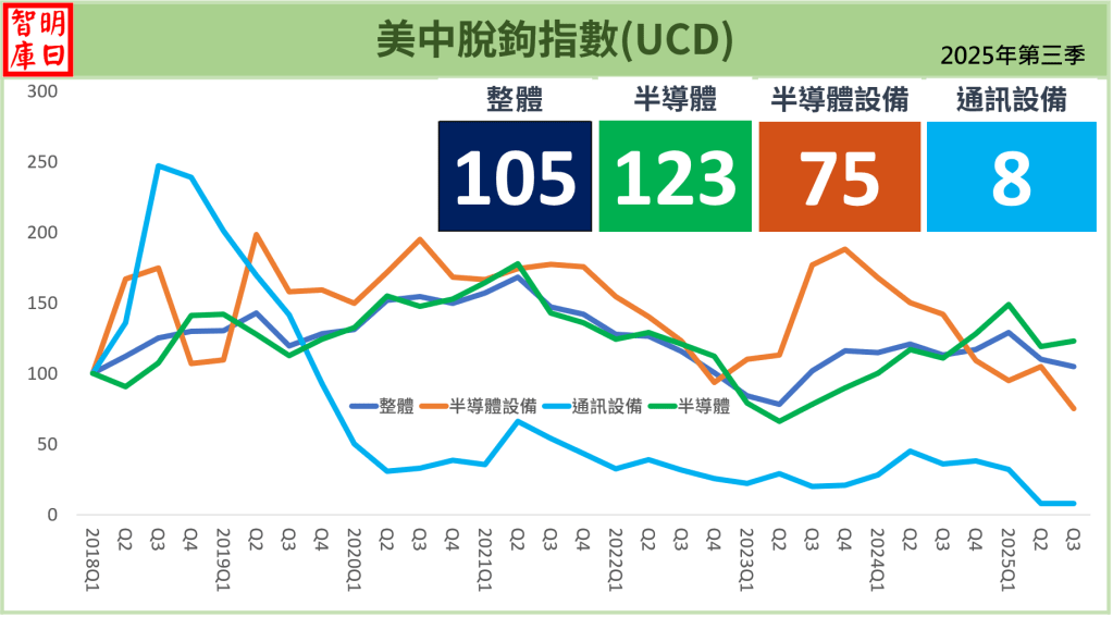 美中到底脫鉤了沒?根據本指標2025年第三季資料顯示,在整體指數、半導體指數、半導體設備指數與通訊設備指數四項指數中,脫鉤中的領域包括通訊設備(指數8)與半導體設備(指數75)。未脫鉤的領域則為半導體(指數123)與整體指數(指數105)。由於總指數仍在100以上,故整體而言,美中呈現未脫鉤狀態。