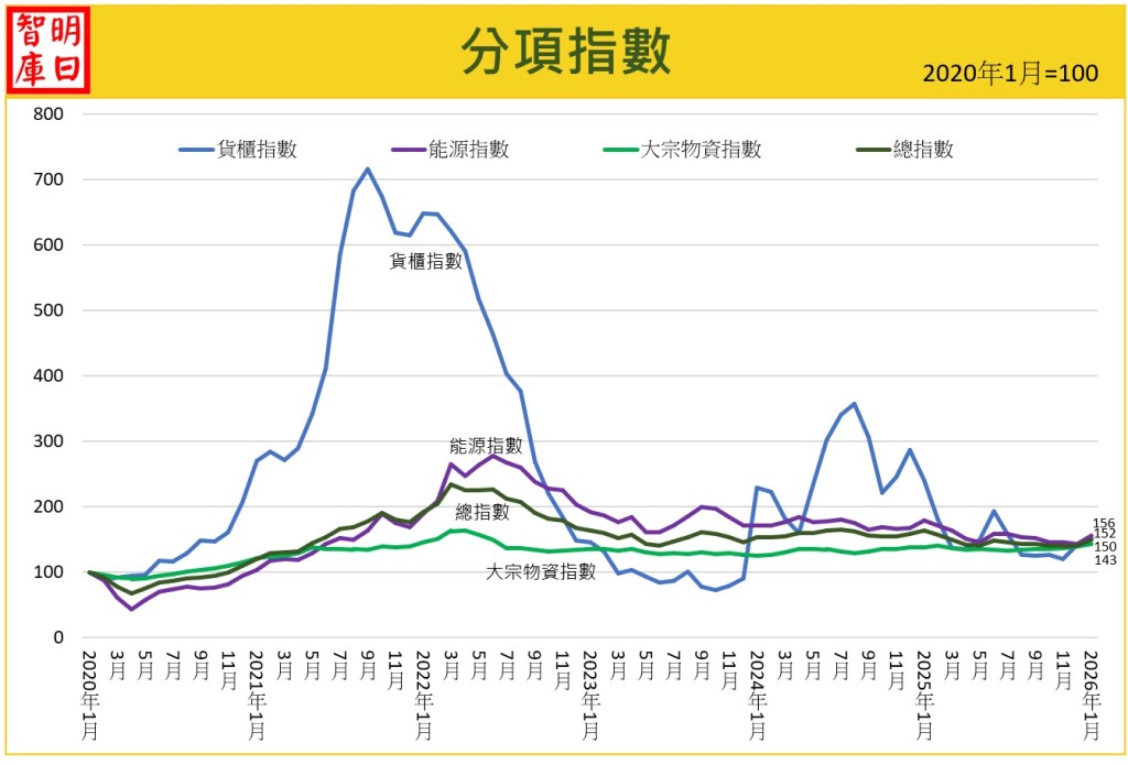 2026 年 1 月 GII 指數上漲 6.4%,指數達 150。三大類指數全面上揚,其中能源價格上漲 9.1%,是推動本月 GII 上漲的主要動能。石油穩定走高,天然氣受極端天氣影響出現劇烈漲幅,貨櫃運價亦受農曆年前旺季需求帶動持續回升。儘管指數反彈,年增率為 -8%,已連續第 11 個月為負值,顯示全球仍處於輸入型通縮型態。