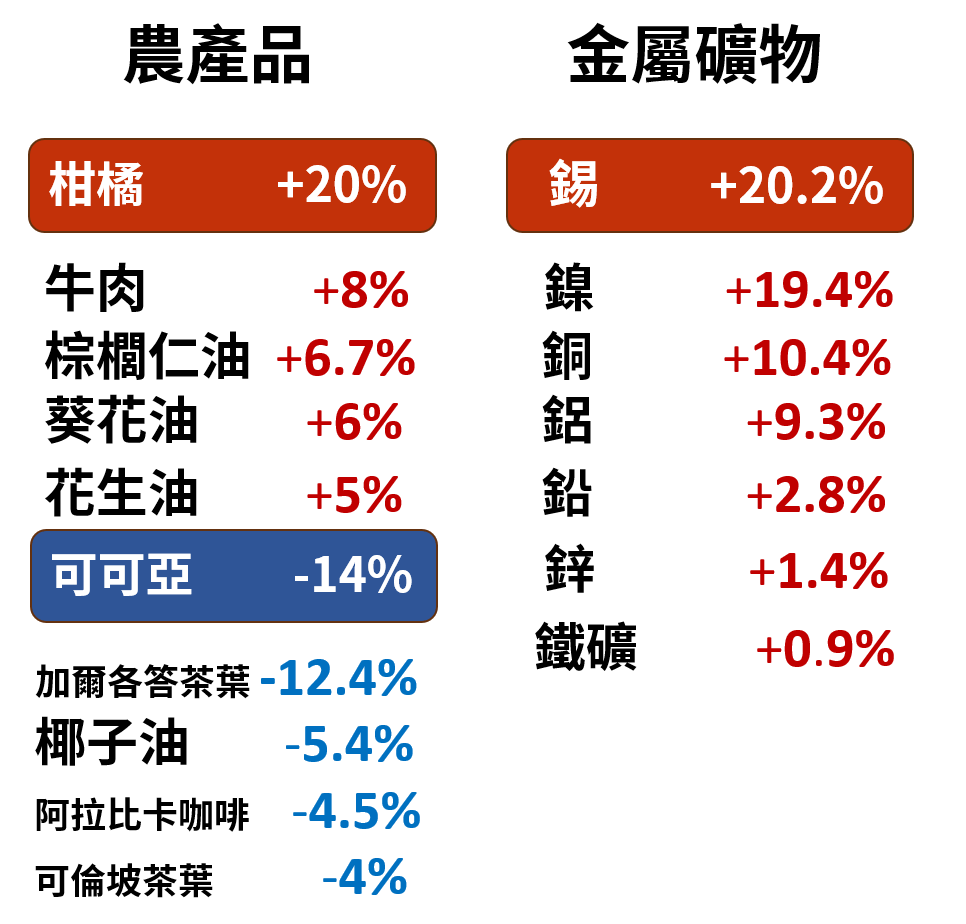 - 7 大礦產全面上漲:錫 (+20.2%) 與 鎳 (+19.4%) 漲幅最大,銅上漲 10.4%。