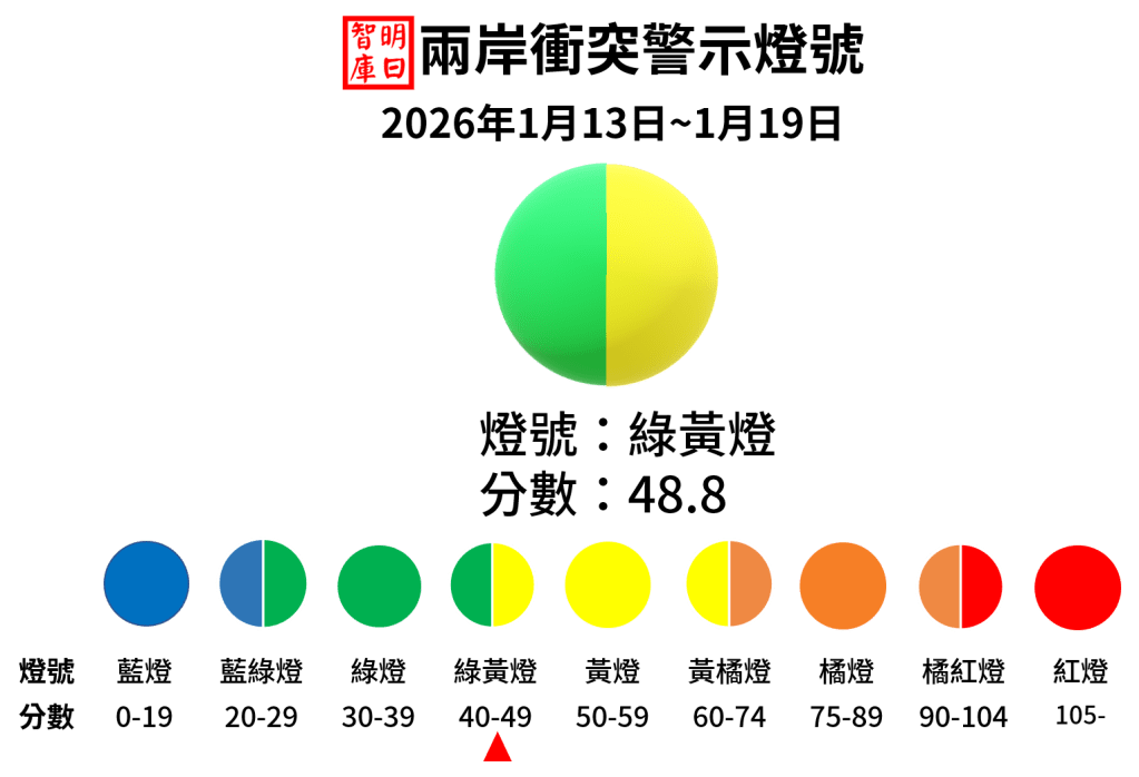 明日智庫自2022年2月起發布兩岸衝突警示燈號,以測量兩岸關係的現有衝突程度。燈號原本用於本智庫「兩岸關係特別專案」中,為擴大協助各界了解兩岸關係基本情勢,故公開本燈號。 兩岸衝突警示燈號依照軍事、宣傳與經濟三個構面的衝突作為測量內容,前兩者即所謂的「文攻武嚇」,是兩岸衝突的舊有模式,而經貿戰的措施是近來新興的衝突。根據三個構面,我們訂出可能的實際衝突項目,並依照衝突的嚴重程度給予不同的權重,整合出一套可以顯示兩岸衝突程度的燈號。