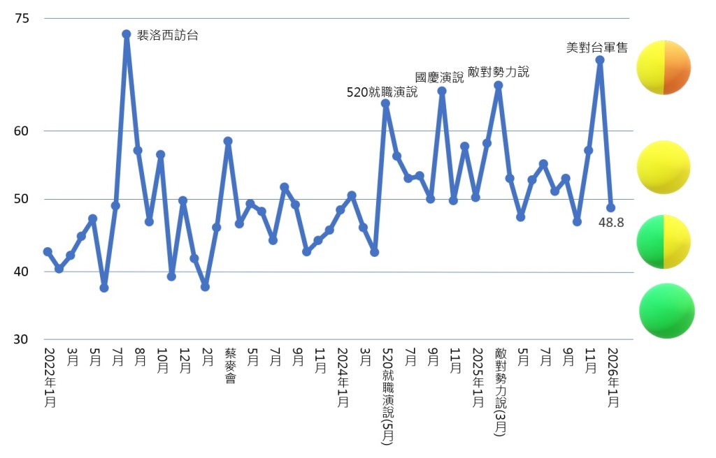 在上月激情的圍台軍演過後,本月兩岸衝突急速降溫。三大分類指數中,經濟維持不變,軍事與文攻強度均出現下降,其中軍事衝突指數降幅最大。本月,中共在台海仍執行4次戰備警巡,其中兩場屬「三面環台」等級。除此之外,解放軍在渤海與南海多次進行軍演,並開展反無人機及無人目標演練。值得注意的是,1月11日,約1500艘中國漁船在橫跨日中中間線的海域排成南北約400公里的直線,引發外界對其可能構成「海上民兵牆」、阻礙他船航行的疑慮,主要針對日本。在美國方面,本月進入軍演休眠期,僅在黃岩島周邊進行了一場美菲聯合軍演。本期以強度較高的15日三面環台戰備警巡為基準,選擇1月13日至19日為觀測期。期間衝突分數由上期的70.2大幅下降至48.8,燈號亦由黃橘燈直接跳降至綠黃燈。